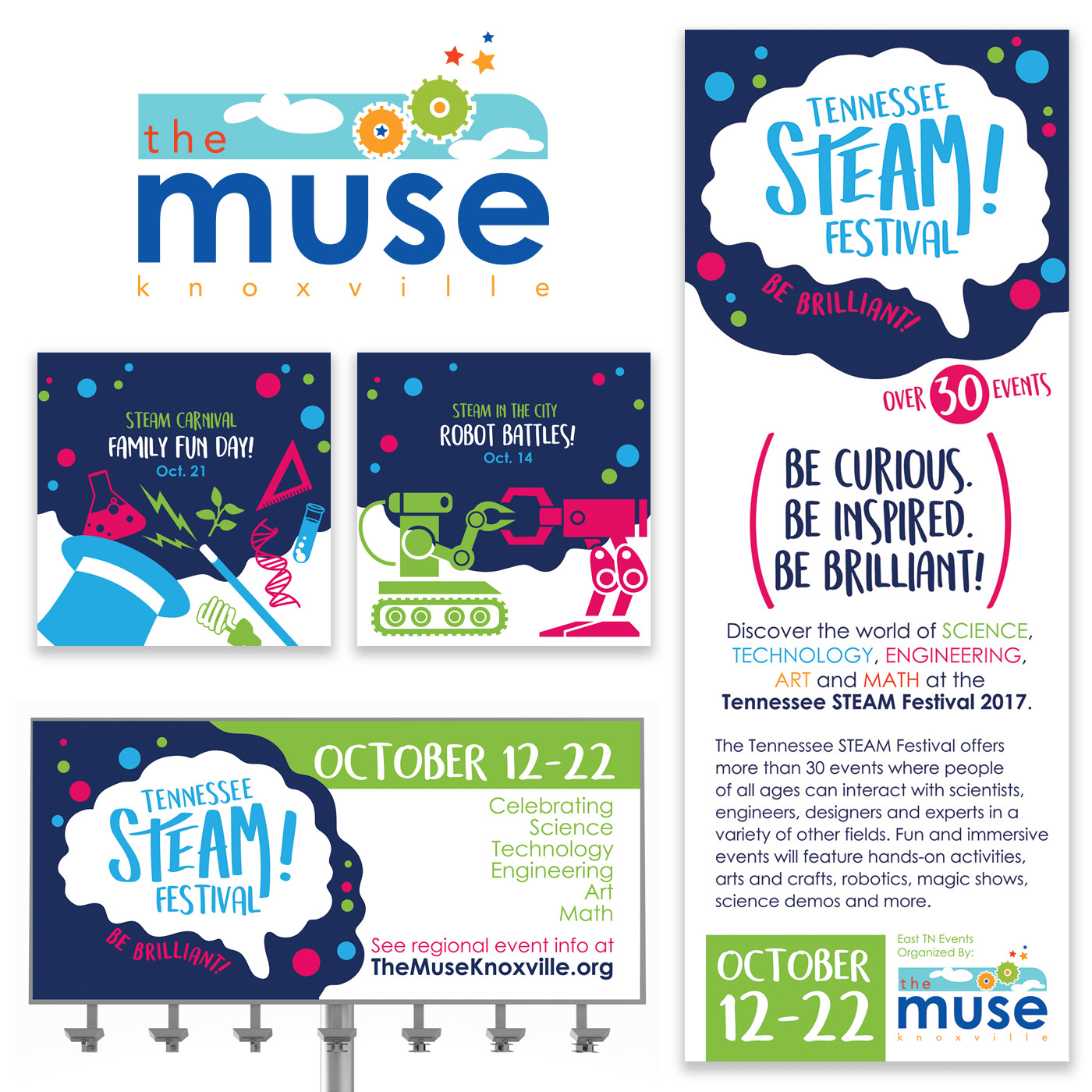 This was a multimedia advertising campaign designed to promote the Tennessee STEAM Festival events sponsored by The Muse. The campaign included social media, billboards, print advertising, brochures and onsite signage.